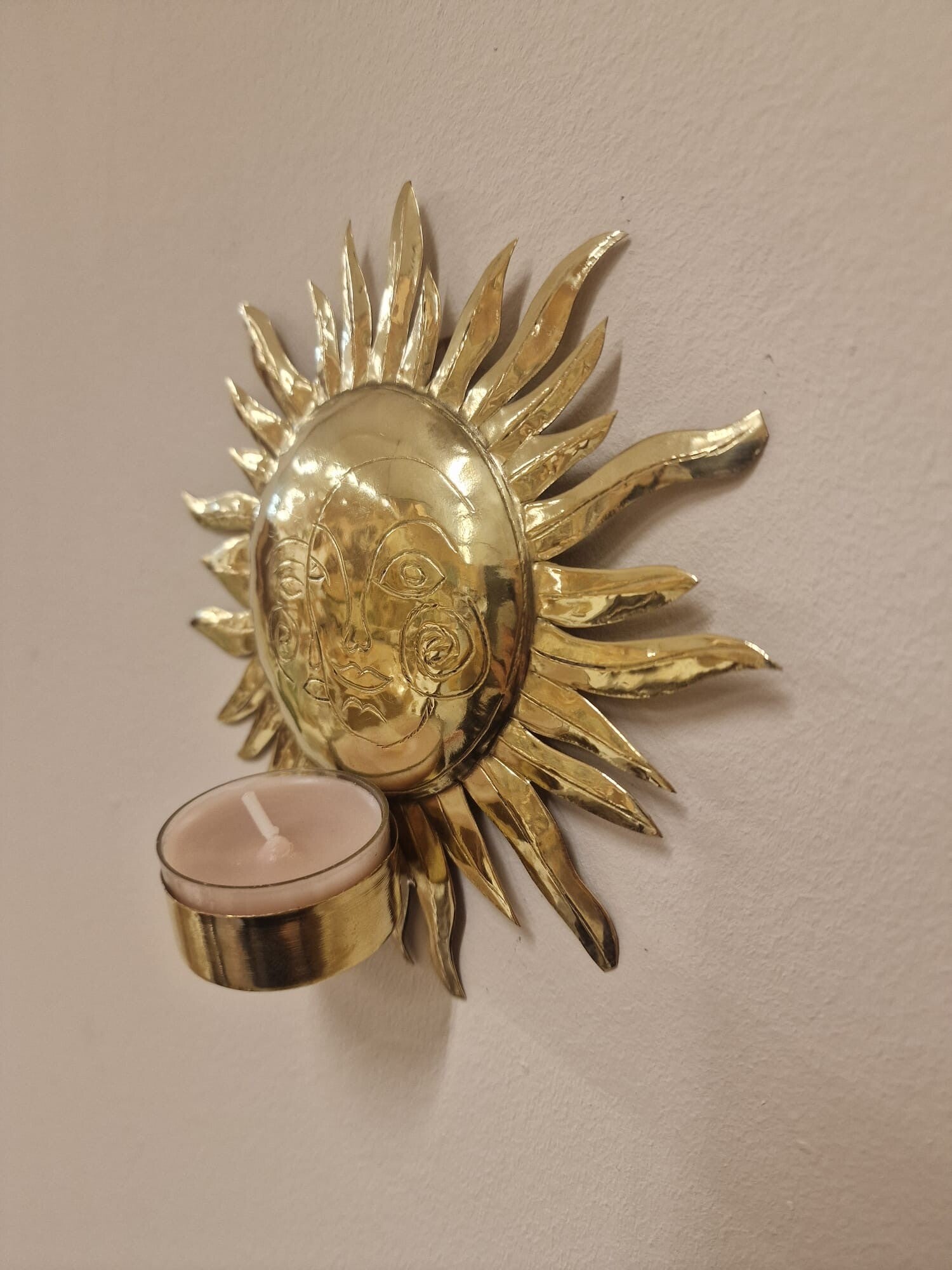 Een prachtige wand waxinelichtje in de vorm van een zon, zorgvuldig handgemaakt van messing in Marokko.